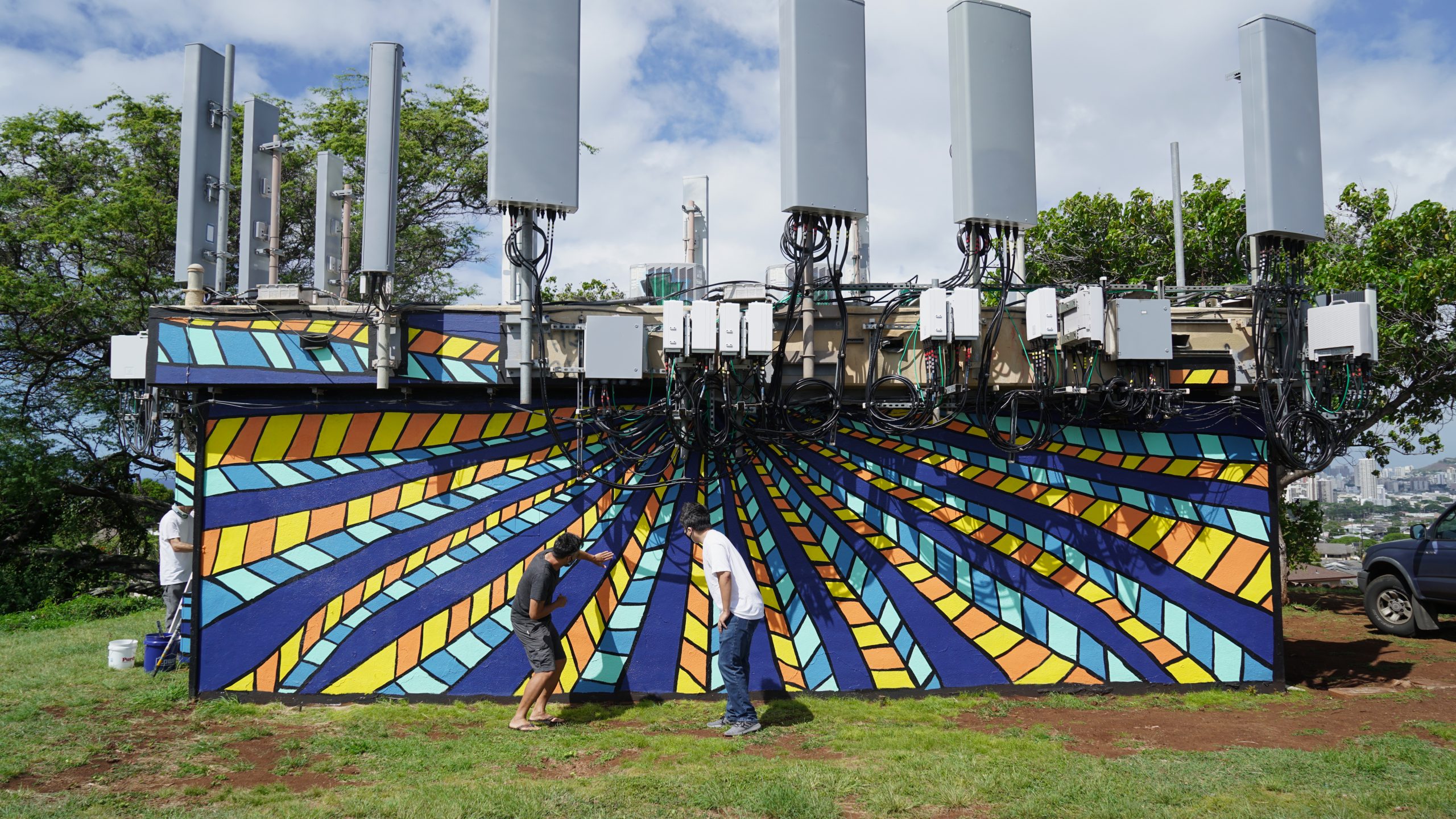 The mural was painted with the help of 70 community members and wraps around a small communications structure in Puʻu o Kaimukī park. The building had been previously covered in graffiti. Enos hopes that this mural–and the collaboration with Oceanit–is the first of many as he works towards engaging with neighborhoods across the island to create community-owned art in public parks, bringing life to their drab structures.